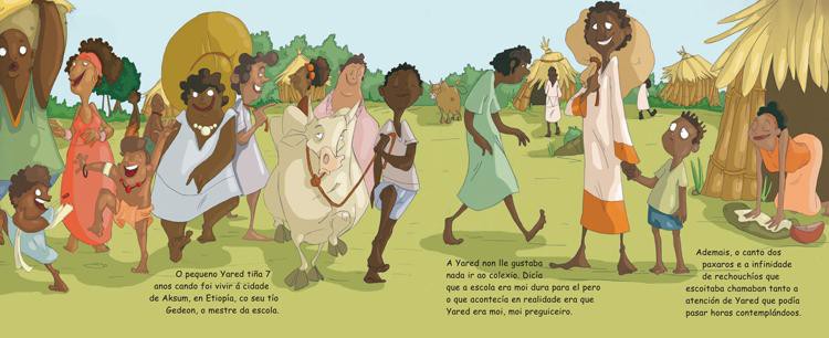 O pequeno Yared tiña 7 anos cando foi vivir á cidade de Aksum, en Etiopía, con seu tío Gedeon, o mestre da escola… Este conto amosa a importancia do tesón, da confianza nun mesmo, da búsqueda de obxectivos e da loita por acadalos.