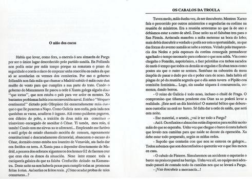 O autor en clave de humor expón: «Os cabalos da Troula: unha loita intrínseca contra da falsidade da falsa política, da manipulación da sociedade para o beneficio persoal ou de partido, o novo labecuísmo, que non procura o ben da comunidade e que no único que se parece á democracia é no demo…